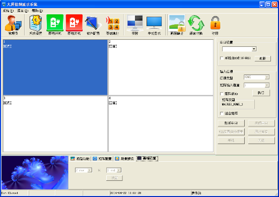 選擇多個拼接單元,2x2為例,選中4個屏后,在信源中選擇信號源,單擊“執(zhí)行”按鈕完成拼接,點擊“圖像凍結”可以凍結當前畫面,再次點擊解除靜像。
