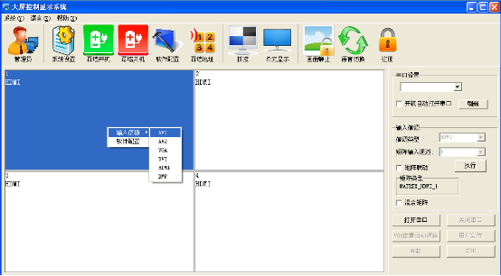 選擇單個或多個拼接單元進行開機/關機和單機鼠標右擊對輸入信號進行設置,也可以點擊“圖像凍結”可以凍結當前的圖像,再次點擊解除靜像。